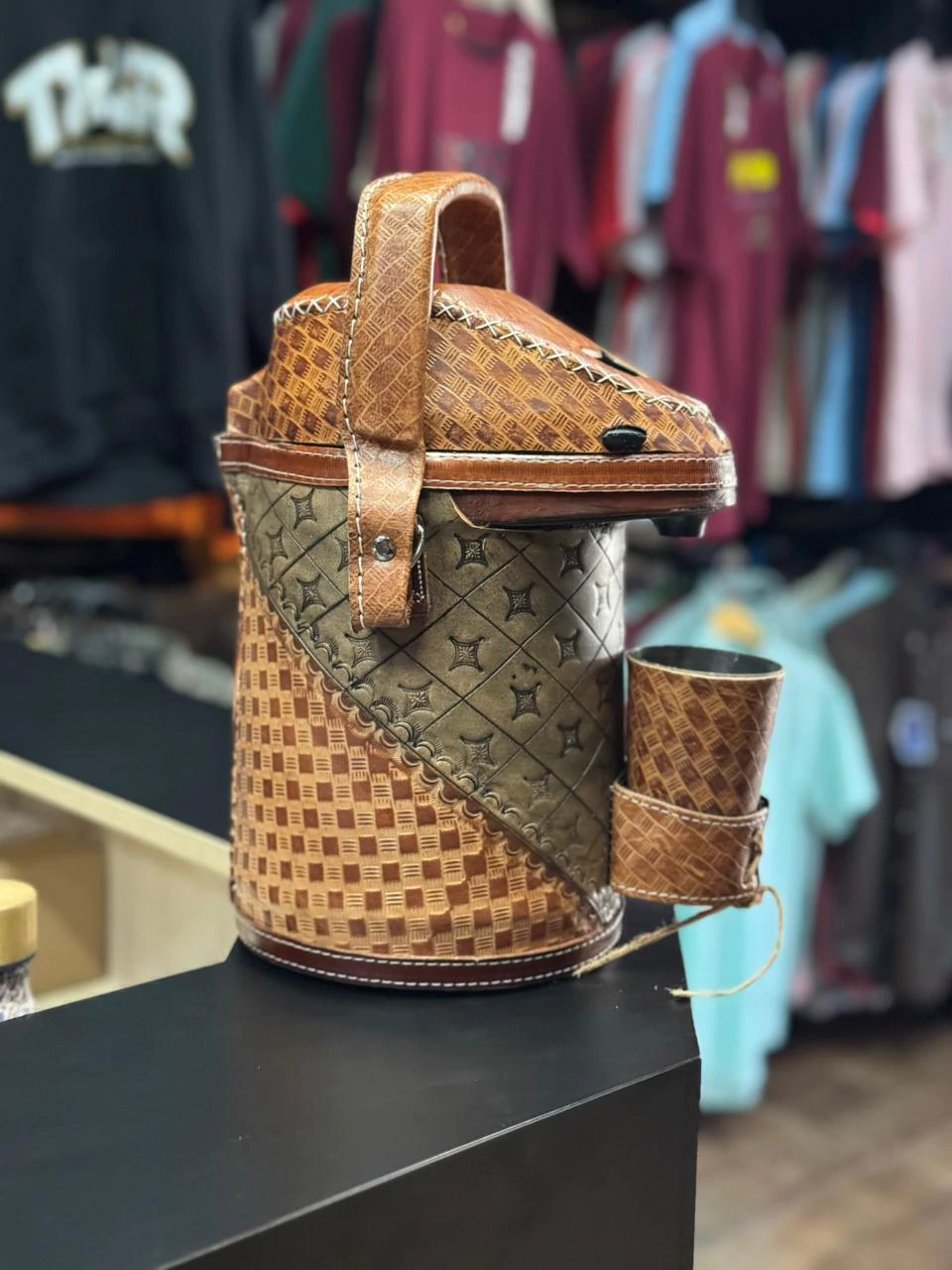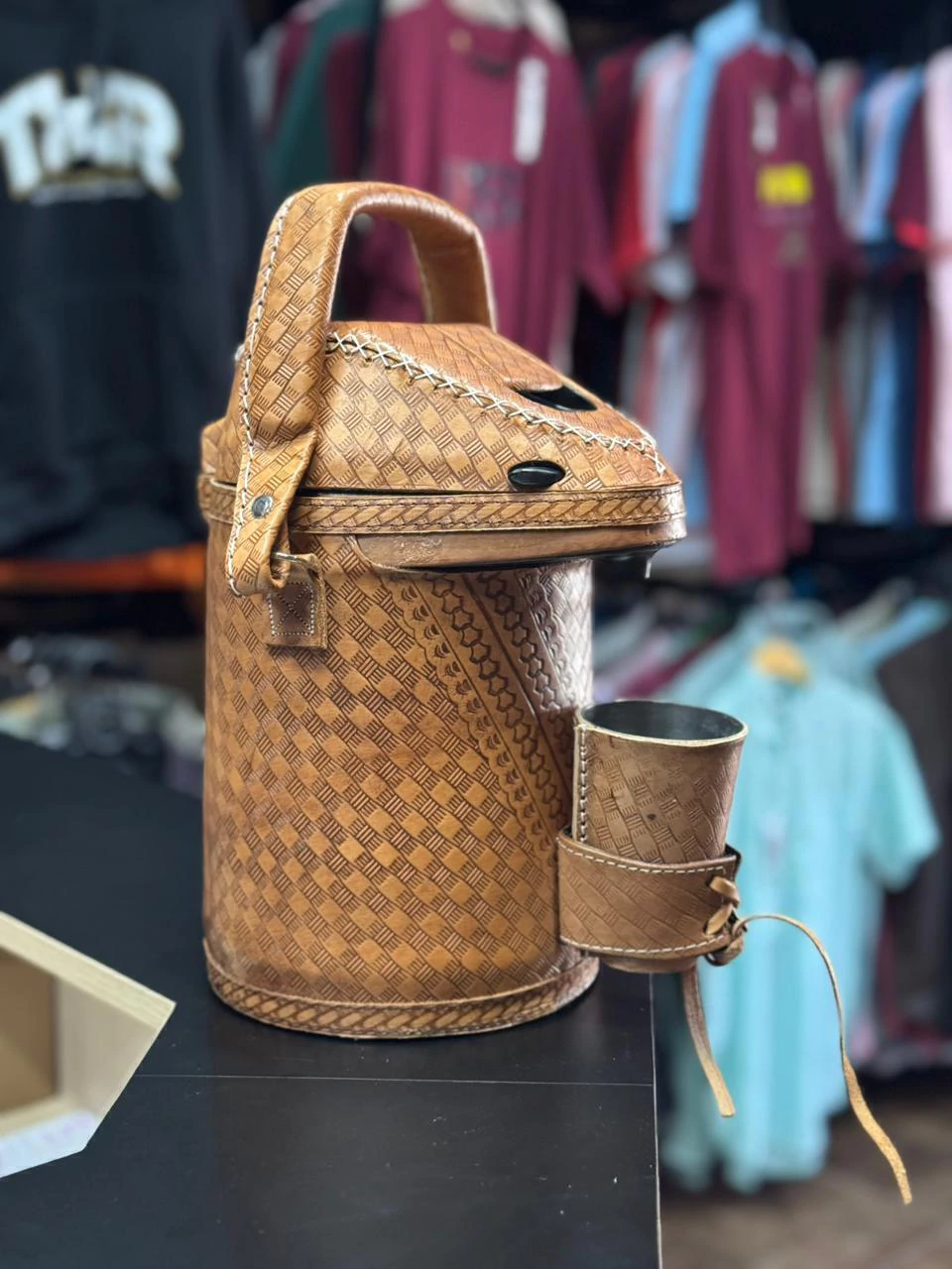 Fabricada com interior em inox e exterior em couro, esta garrafa combina durabilidade e elegância. O revestimento em couro não só proporciona um toque sofisticado, mas também oferece uma pegada confortável e segura, tornando-a perfeita para uso em casa, no escritório ou em passeios.